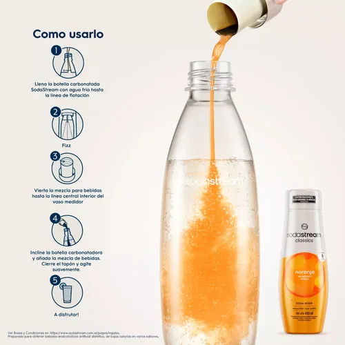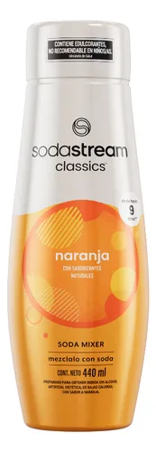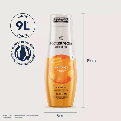 Con una botella de 440 ml preparás hasta 9 litros de soda sabor naranja, lista en segundos con tu máquina Sodastream.