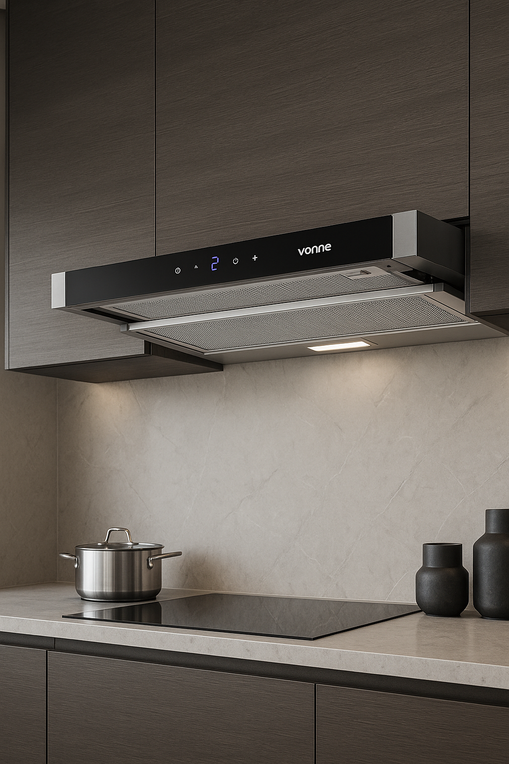 Diseño telescópico que aparece solo cuando lo necesitás y se oculta al terminar. La Vonne CCEI-TE60 ofrece practicidad, potencia y un elegante acabado en acero inoxidable.