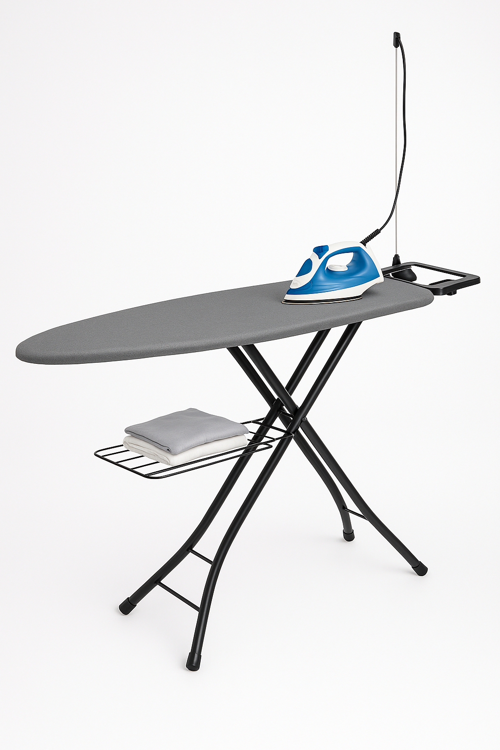 - 🧺 Porta-plancha + estante inferior: todo a mano, más ritmo entre prenda y prenda.
