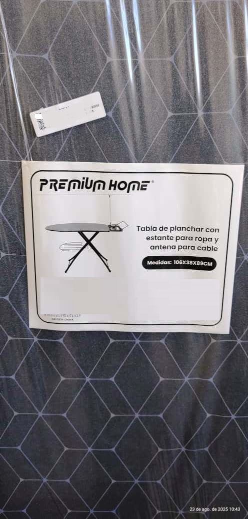 Tabla Premium Home 106×38×89 con antena porta-cable, estructura metálica estable y funda negra lavable. Plegable y liviana: guardado en segundos.
