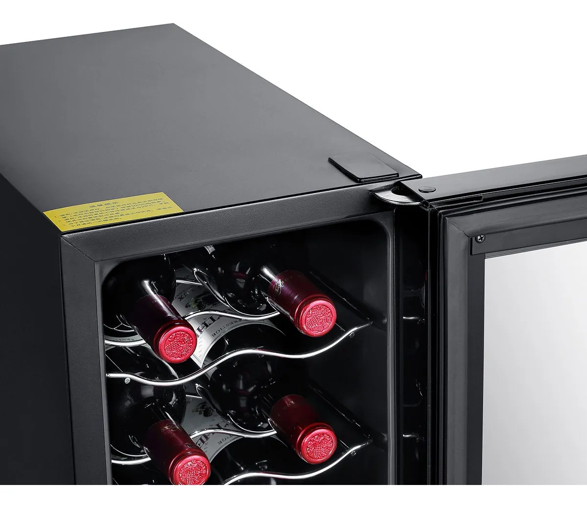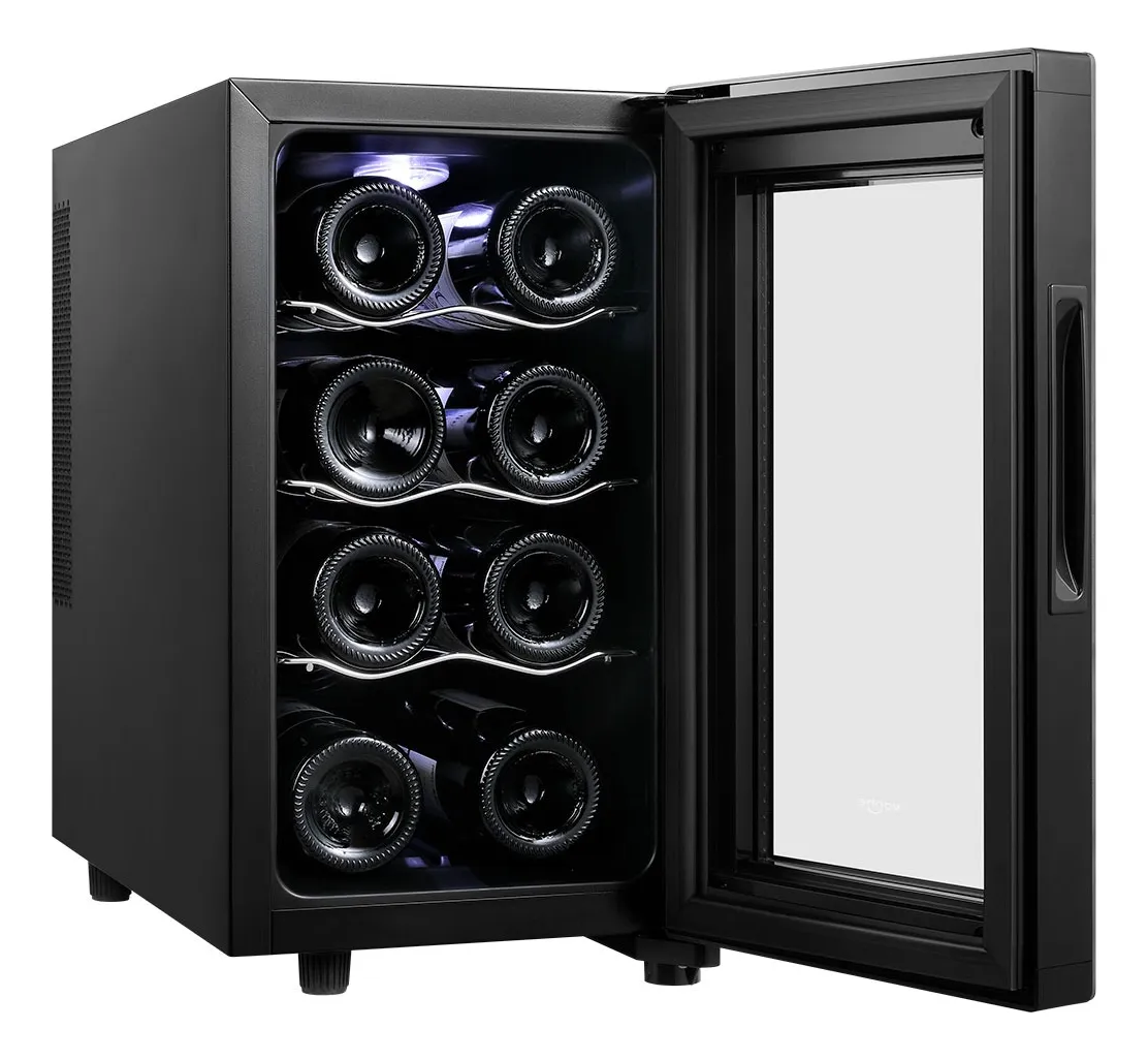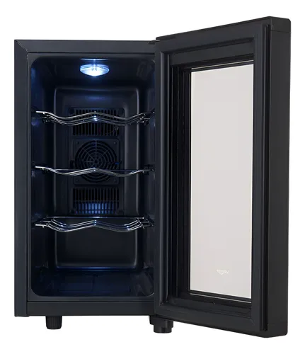 Cava de vino con capacidad para 8 botellas. Un equipo compacto y sofisticado en color negro, pensado para dar distinción a tu hogar y mantener cada etiqueta en condiciones perfectas.