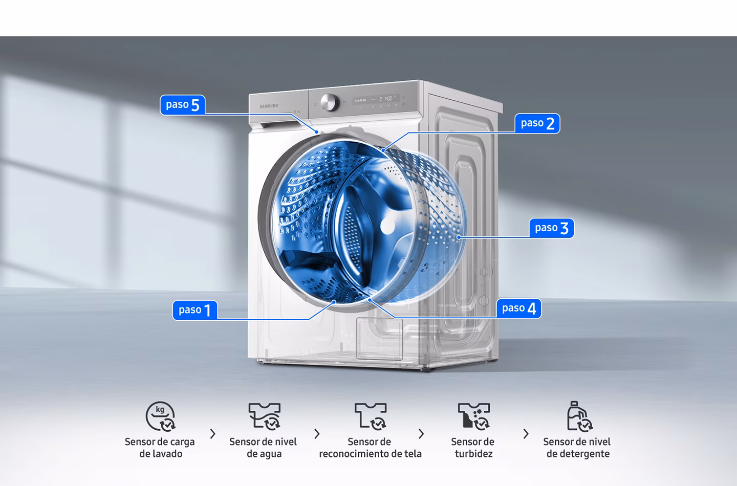 - 🧼 AI Wash, sensores avanzados analizan tejidos y suciedad para usar el detergente perfecto.