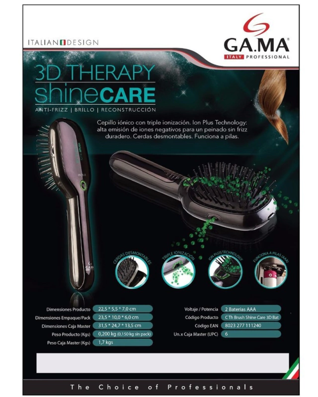 🔍 ¿Batallas constantemente con el frizz y la falta de brillo en tu cabello? El Cepillo Gama 3D Therapy Shine Care Antifrizz Ionico es tu aliado ideal. Este cepillo emplea tecnología avanzada para darle a tu cabello el cuidado que se merece, dejándolo suave, brillante y sin frizz.